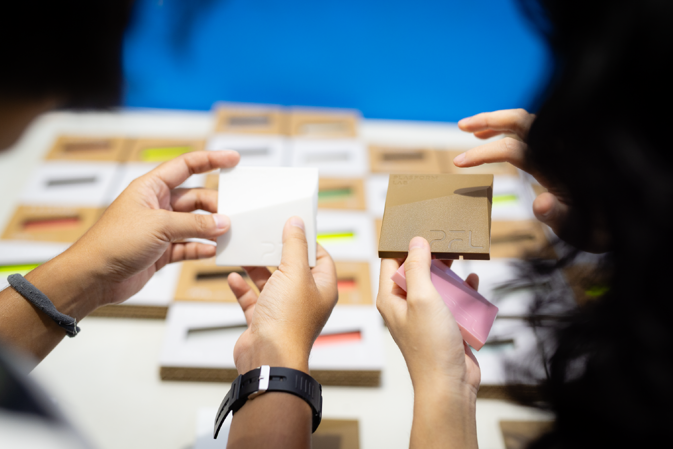 每一組都包含兩種不同表面紋理、色彩與咬花效果,每一件都以實際射出成型方式製作,讓參與者能夠直接拿起觀察、觸摸比較,可以體驗咬花紋理在曲面與斜面上的光影變化與反射差異。